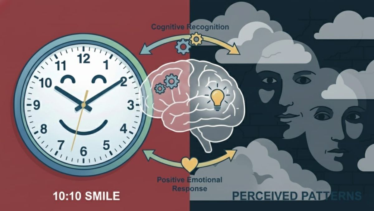এই ১০:১০ টাইমের পেছনে কাজ করে pareidolia নামের একটা অদ্ভুত প্রবণতা – যেখানে আমাদের মস্তিষ্ক এলোমেলো জিনিসেও পরিচিত মুখ, ছবি আর প্যাটার্ন খুঁজে নেয়। ছোটবেলায় আমরা যেমন মেঘের দিকে তাকালে নানা ধরনের ছবি দেখতাম, চাঁদে বুড়ো মানুষ দেখতাম, আজ ইমোজি দেখে তৎক্ষণাৎ অনুভূতি বুঝে ফেলি – সবই এই একই প্রবণতার কারণে। আমাদের মস্তিষ্কে fusiform face area বা FFA নামে একটা অংশ আছে, যা মুখের মতো কিছু দেখলেই দ্রুত সক্রিয় হয়ে ওঠে। সরল চিহ্ন বা ইমোজি তো আরও দ্রুত প্রোসেস হয়।
